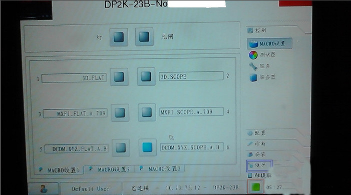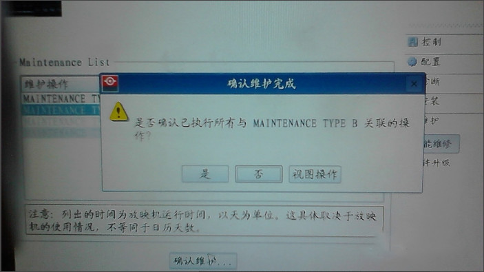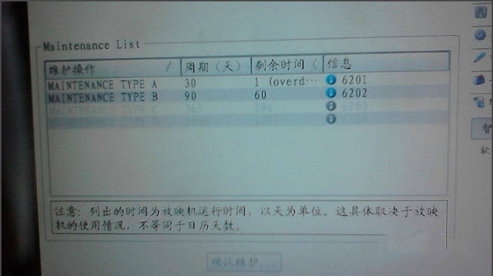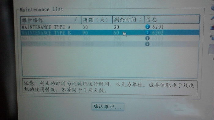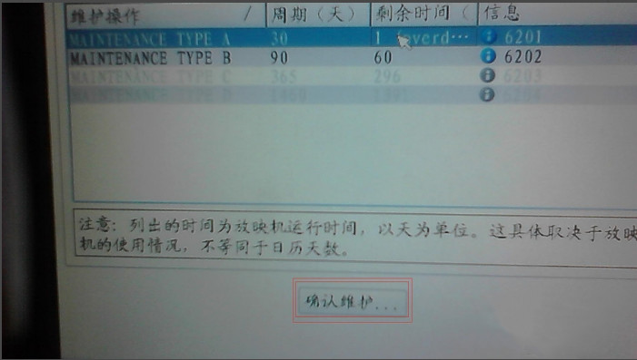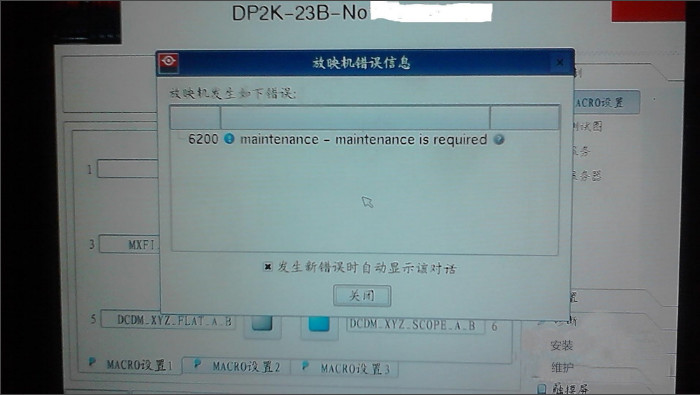为了巴可(Barco)数字放映机能够减少故障率,使其能够更好,更长久的正常运行,特别设置了6200这个故障代码,说是故障其实不是故障,它只是用来提醒使用者要定期或者不定期的对放映机进行各种必要的维护,比如过滤网清洁等等,提示灯为橙色,因此只有关闭这个提醒就可以了,指示灯就会变绿,恢复正常.下面就给各个放映员进行分部操作: